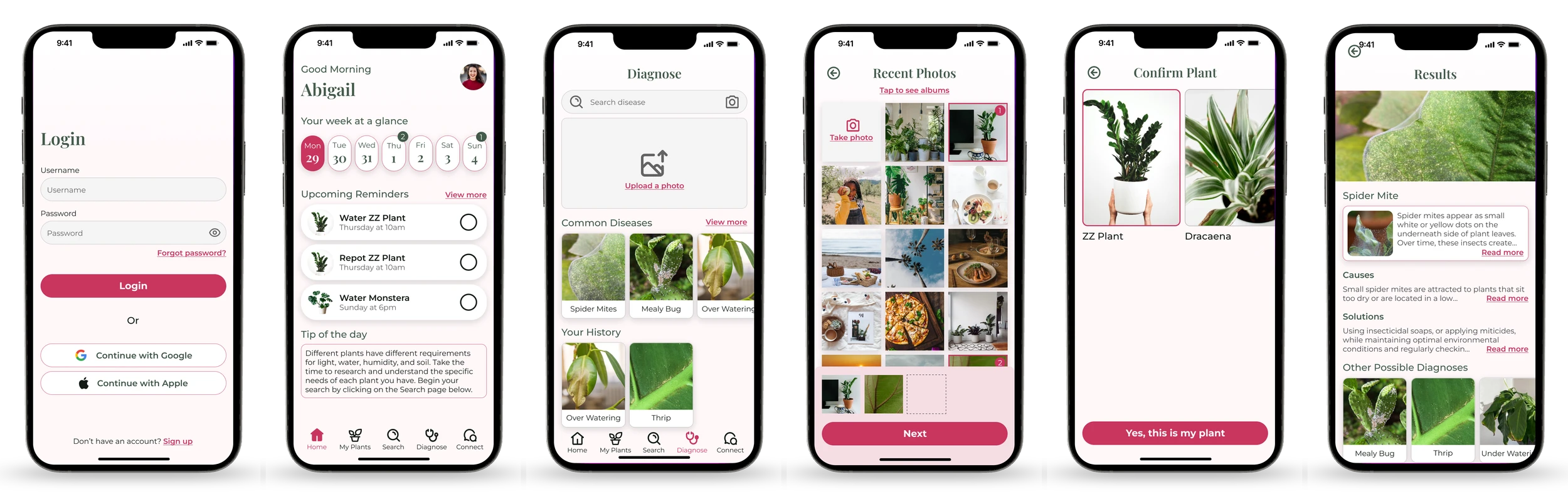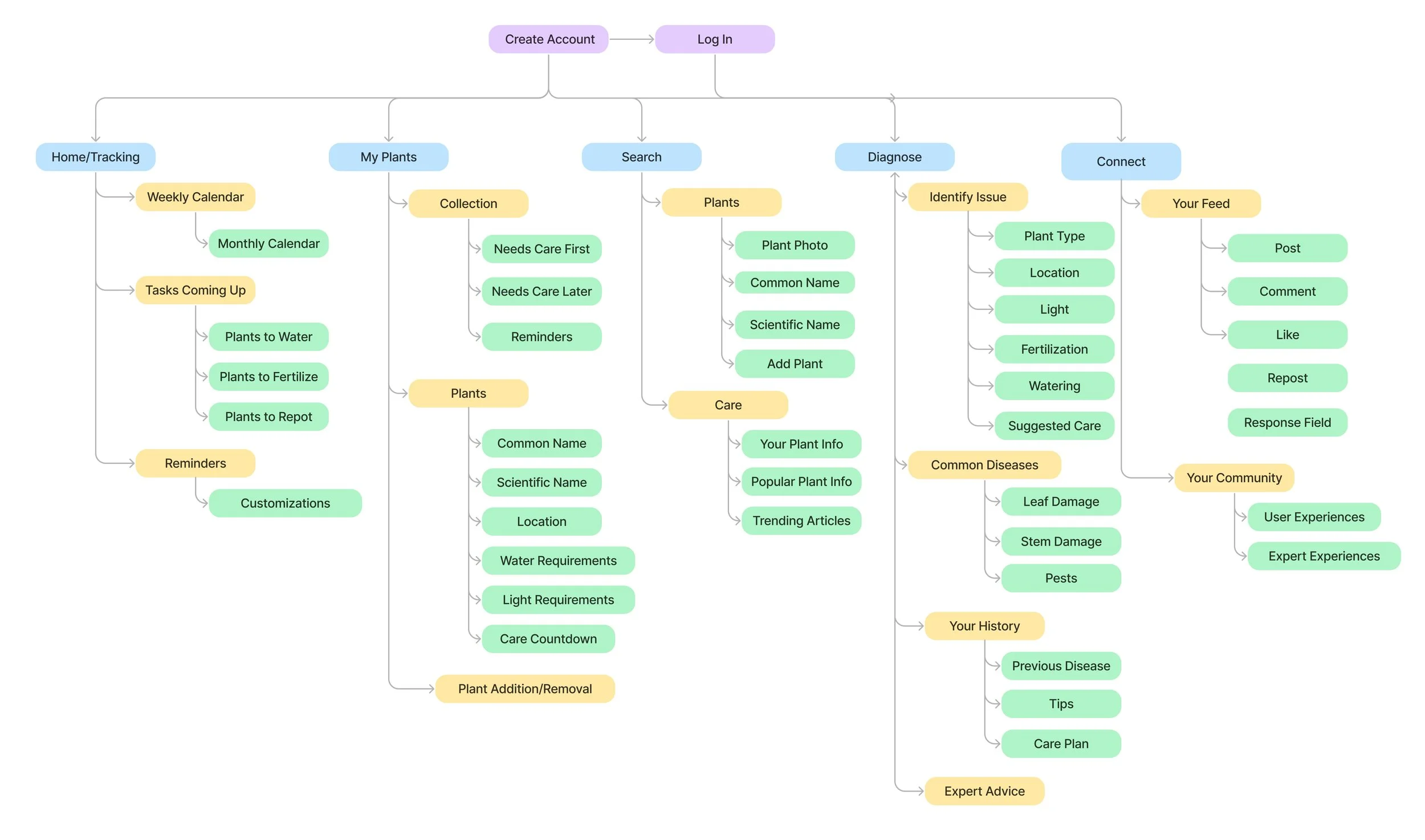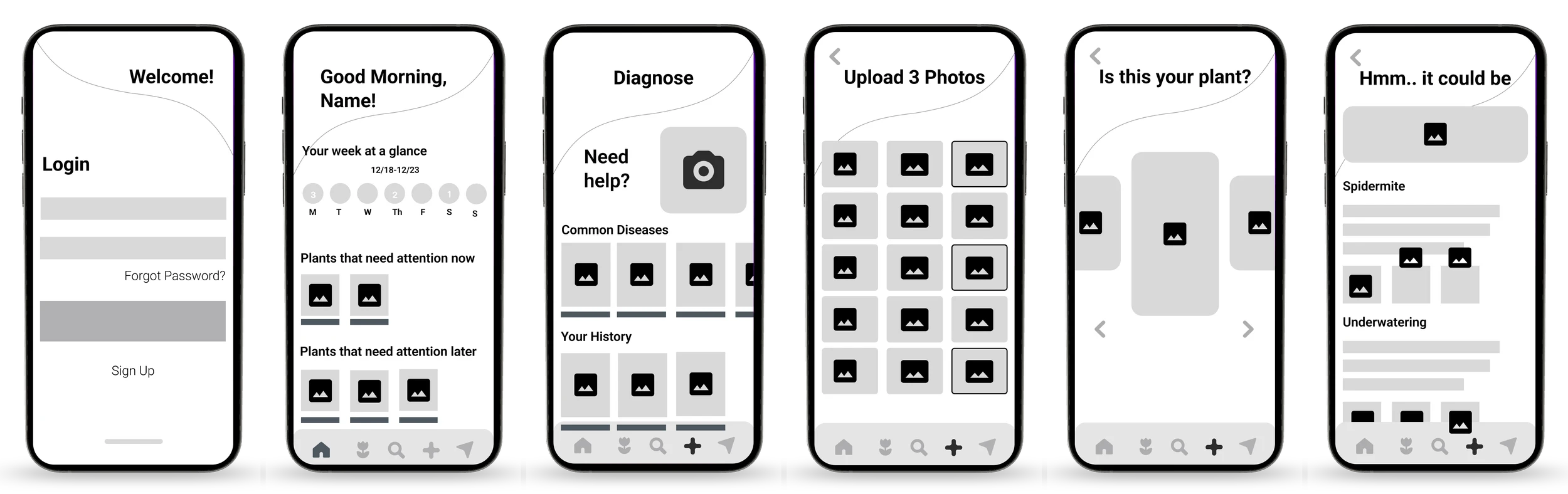 I mapped core user flows before touching Figma — adding a plant, diagnosing a problem, setting reminders, and browsing care guides. Getting the information architecture right early meant the wireframes had a clear logic to them from the start, rather than being figured out at high fidelity.