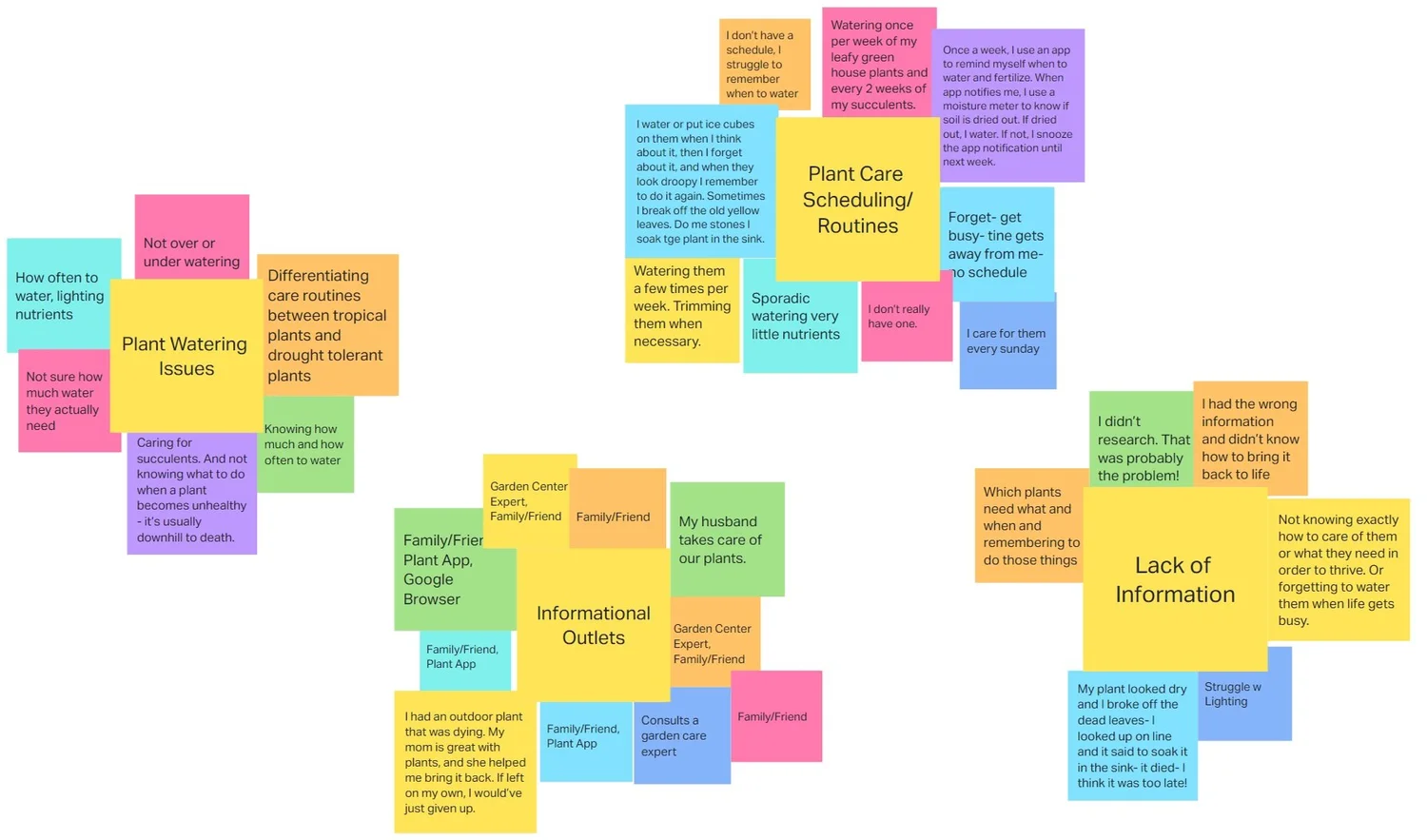 What I found across interviews was consistent enough to feel like a pattern pretty quickly. People were significantly less educated about their plants' care requirements than they realized — and they were also deeply forgetful, not because they didn't care, but because nothing in their environment prompted them at the right moment, in the right way. The "I just water it when I remember" quote wasn't an outlier. It was the norm.