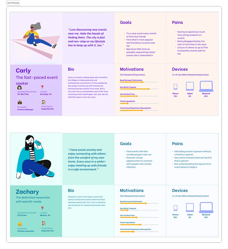 To understand the needs of LGBTQ+ community members, I used user personas and conducted secondary research which allowed me to analyze patterns from existing platforms and community feedback.